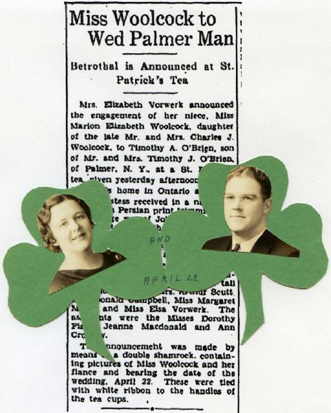 Engagement of Marion Elizabeth Woolcock to Timothy A O'Brien, March 1935