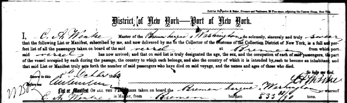 Arrived in the Port of New York 5 October 1863 aboard the Bark