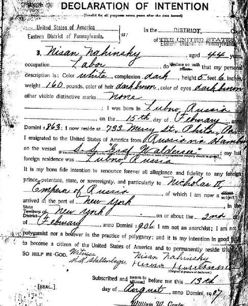 Nahinsky Declaration of Intention, 1907