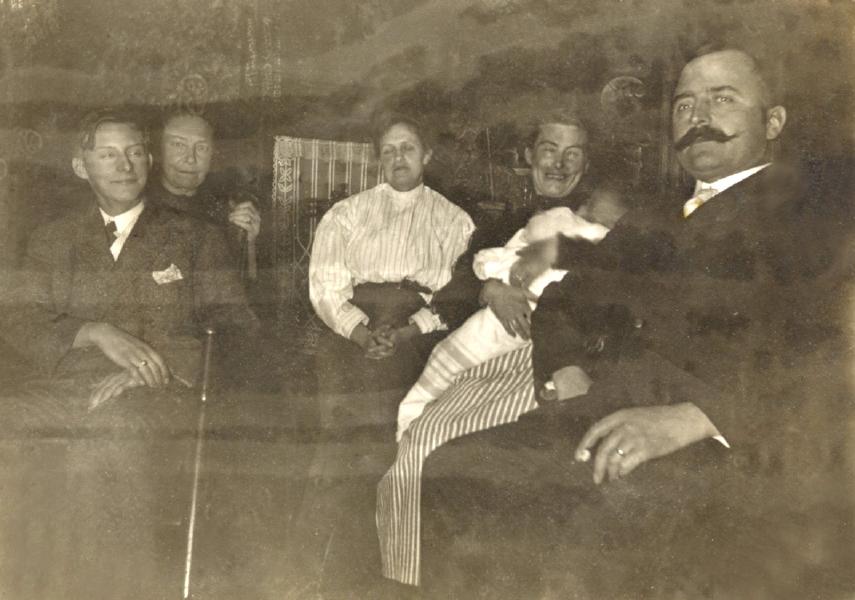 Vorwerk & Laurier families, 1906: Carl Laurier, Josephina Schwab Vorwerk, Libby Kammerer Vorwerk, Friederika Vorwerk Laurier holding infant Frederick Augustus Vorwerk, and Eugene Laurier. Likely photographed by August Vorwerk.