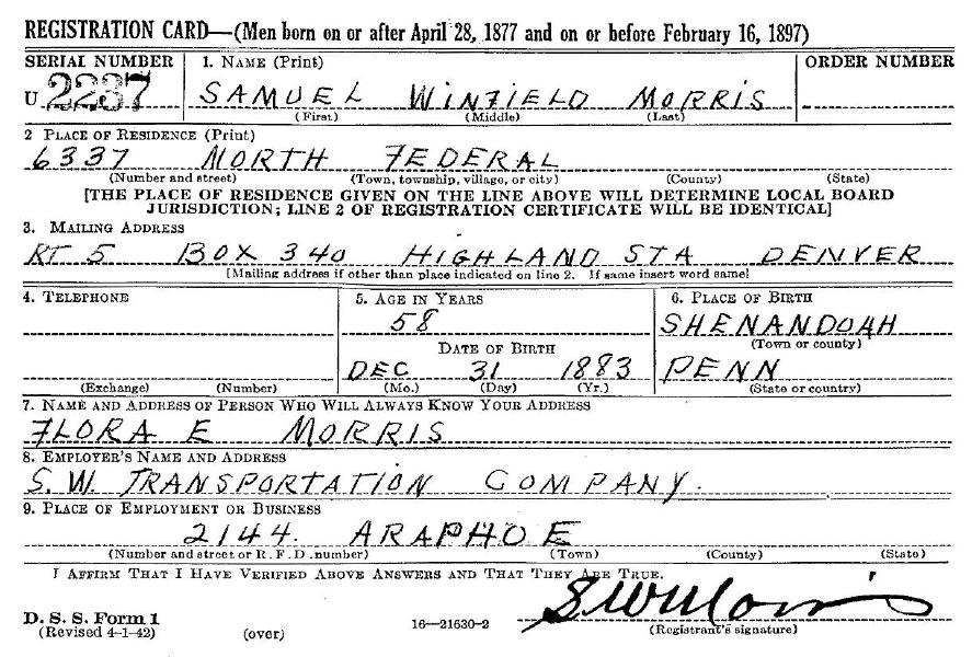 Samuel Winfield Morris, World War II draft registration
