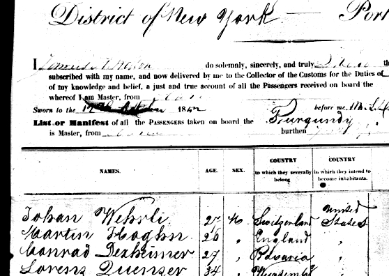 Arrived in the Port of New York aboard the Havre Packet Ship