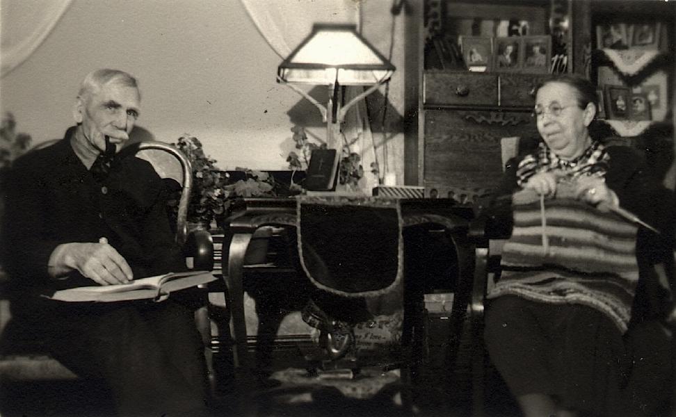 In their parlor, Cornelius Frank with his book and Phoebe's knitting hands a blur, mid-1920s