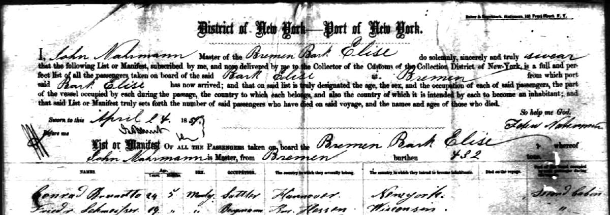 Arrived in the port of New York on 24 April 1857 aboard the Bremen Bark