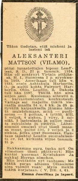 Sander Mattson, died 27 January 1924