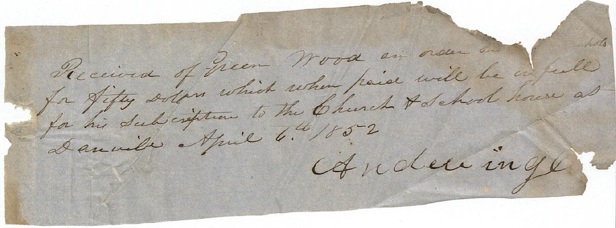 Receipt from Andrew Inglet, Danville Church & School subscription, 6 April 1852