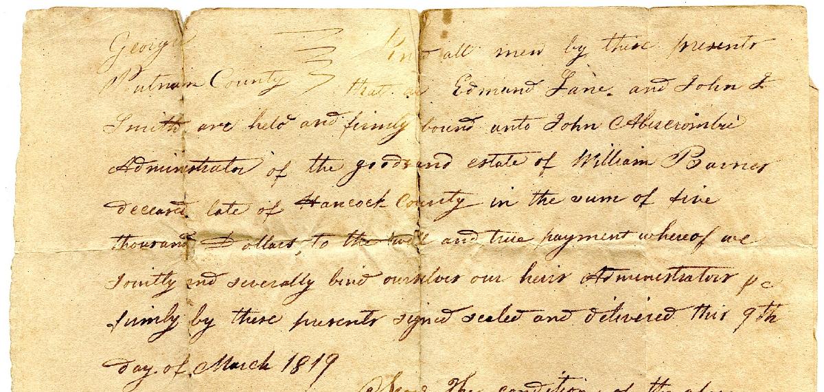 9 March 1819 document related to administration of the estate of William Barnes by John Abercrombie.