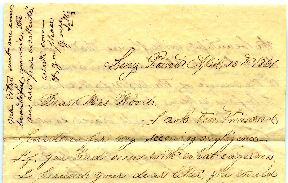 Letter from Sallie Lincecum to Evelina Wood, 15 April 1861
