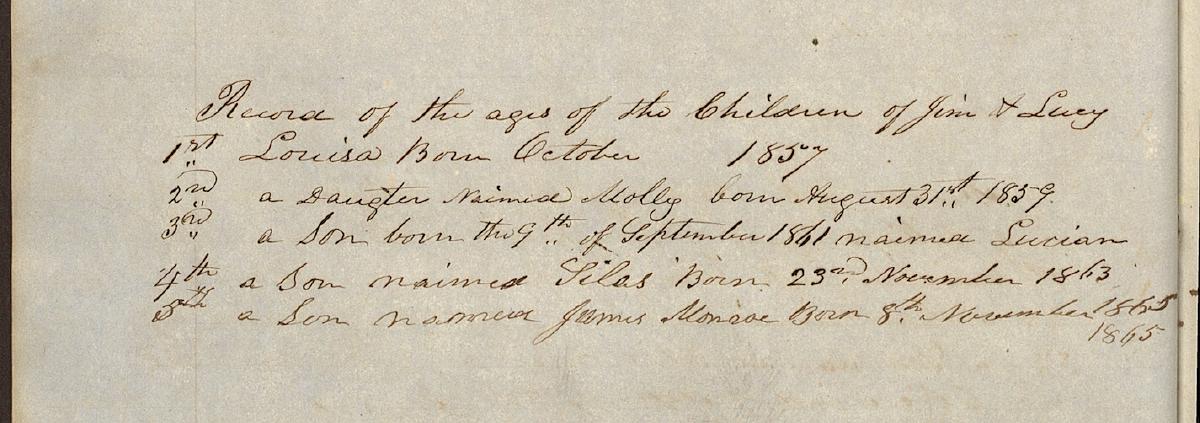 Green Wood's record of Jim & Lucy's children, born 1857-1865