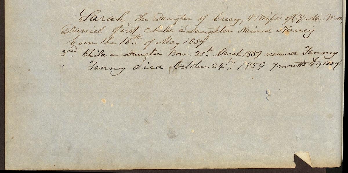 Green Wood's record of Sarah & Daniel's childrern, born 1857 & 1859