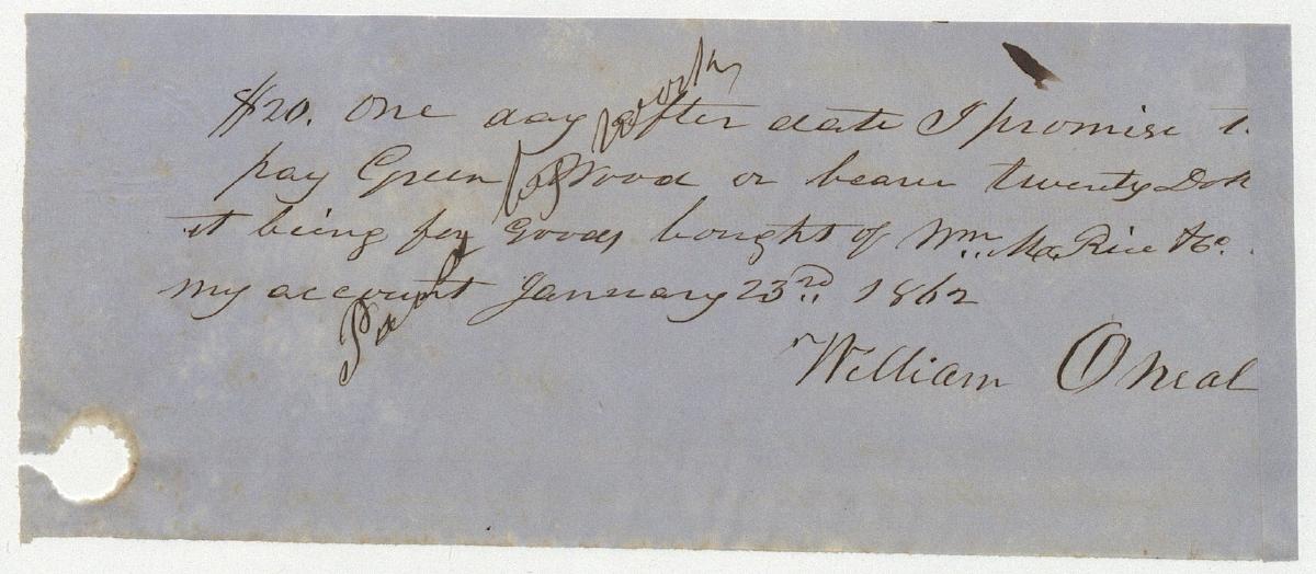 William McGee O'Neal, note to Green Wood, 23 January 1862