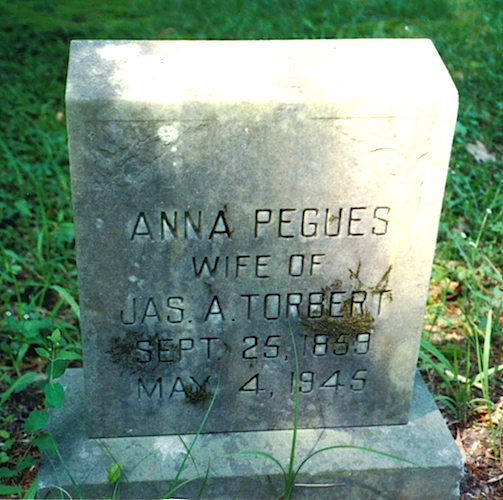 - James Anthony Torbert and Anna Mary Pegues appeared in the US federal census of 1 June 1900 in Jackson's Store Precinct, Marengo County, Alabama. Other members of the household included Sidney Ernest Torbert, Florence Edna Torbert, Thomas Jefferson Torbert, Sarah Decima Torbert, James Everett Torbert, Rebecca Pegues Torbert, George Whitfield Torbert, Sylvester Sledge Torbert and James Bartholomew Pegues.