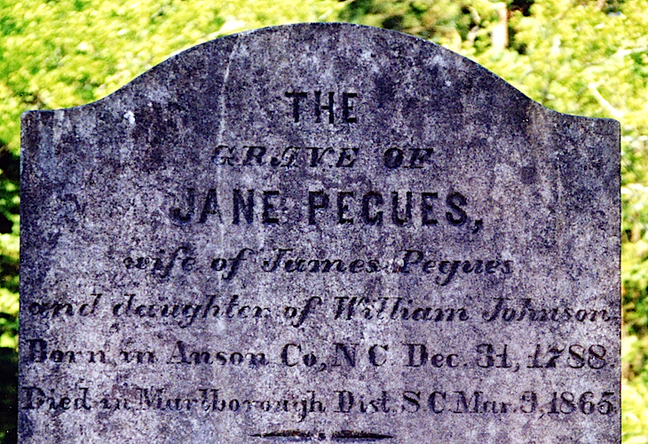 - Jane Johnson appeared in the US federal census of 1 June 1850 in Marlboro District, South Carolina. Other members of the household included James Pegues and Rufus Randolph Pegues. Also in the household was Harriet Pegues, age 14, likely her granddaughter, although Harriet is also enumerated with her parents in Chesterfield.